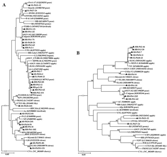 Unrooted maximum-likelihood (ML) phylogenetic trees generated from the nucleotide sequences of CP (A) and MP (B) genes of apple stem grooving virus (ASGV). The reported sequences in each tree were marked by its isolate name followed by a GenBank accession number and host name. The sequences determined in this study were highlighted by black triangles and marked by their geographic origins, hosts and clone IDs, and sequences from seedlings and seeds were identified with ‘S’ and ‘Z’. The corresponding RNA sequence of cherry virus A (CVA) was used as a outgroup in each phylogenetic tree.