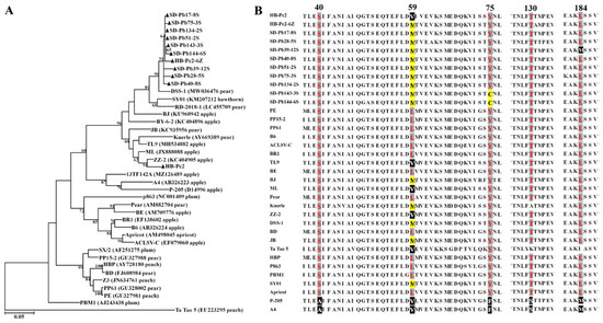 Multiple alignment of ACLSV CP sequences obtained from this study and representative sequences referred from GenBank revealed uneven distribution of the variances along the CP and that the amino acid combination S40-M/V59-Y/C75-T130-L184, similar to the S40-L59-Y75-T130-L184 identified by Yaegashi et al. (2007) [41], presented in clones analyzed in this study (Figure 3B), suggesting that these clones were belonged to B6 type.