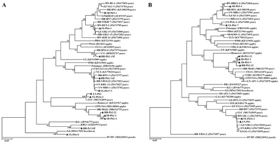 Unrooted maximum-likelihood (ML) phylogenetic trees generated from the nucleotide sequences of CP (A) and TGB (B) genes of apple stem pitting virus (ASPV). Each reported sequence was marked by its isolate name followed by a GenBank accession number and host name. The sequences determined in this study were highlighted by black triangles and marked by their geographic origins, hosts and clone IDs, and sequences from seeds were identified with ‘Z’. The corresponding sequence of peach chlorotic mottle virus (PCMV) was used as a outgroup in each phylogenetic tree.