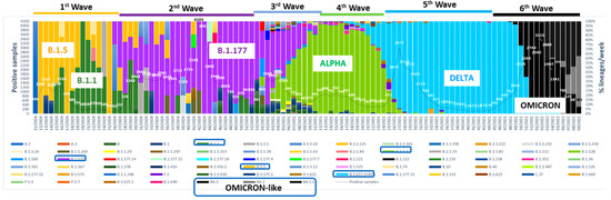 Viral genomic information is crucial to developing vaccines and antivirals and to readapting these therapies when escape or resistance mutations are identified. For instance, studying genetic changes in influenza viruses, which are constantly changing, helps to select candidate vaccine strains [20], to detect and monitor resistant variants to antiviral drugs among currently-circulating influenza viruses or strains detected in hospitalized patients under treatment [21], to identify viral factors related to virulence, as well as prevent the potential of influenza viruses from animals infecting humans. Another example of success is the polio vaccine, for which the first prototype was developed by Hilary Koprowski in 1950 but not approved [22], followed by the vaccine developed by Jonas Salk in 1952 using attenuated virus, and, finally, the attenuated Sabin vaccine given orally, composed of the three serotypes or strains, Sabin strain type 1, type 2 and type 3 [23], which has been used to nearly eradicate polio infection worldwide [24]. Poliovirus sequencing is currently performed to identify the virus, detect genetic features such as recombinant events in addition to genetic drift, propose the likely origin, track geographic patterns of spread, and determine the appropriate vaccination response [25]. The sequencing of West African Ebola outbreaks showed that all strains were related and that the virus could spread sexually [26]. Zika sequencing was able to confirm the origin and spread of the virus in the Americas with a Brazilian origin of the virus that spread through the Americas [27] and that the Caribbean was the main source of Zika in Miami, particularly from cruise ships [28]; and sequencing also revealed that the causal agent of severe respiratory illness and acute flaccid myelitis in some children in Spain in 2016 was enterovirus D68 [29]. In the case of SARS-CoV-2, it is clear that sequencing is required for continuous surveillance, for studying nosocomial or community outbreaks such as those in nursing homes or among health care workers, for confirming reinfection after a long period of negative PCR detection, identifying new variants with different transmission capabilities such as vaccine escape mutants, drug resistance genomes or viral dynamics in a chronically (long-COVID) infected patient [8,30,31,32,33,34]. For example, NGS application for viral surveillance was able to describe, at the beginning of the first wave of SARS-CoV-2 infection (Figure 1), the predominance of the variant B.1.5 (51%) in our geographic area of Barcelona until May 2020, when variant B.1.1 (33%) significantly increased, coinciding with the start of de-escalation. However, the end of the lockdown (June–July 2020) and opening of summer activities coincided with the detection of variant B.1.177, which became the predominant lineage during the entire second wave until the end of 2020. At the beginning of 2021, B.1.1.7 (Alpha variant) gradually replaced B.1.177 and became dominant during the late third (55.44%) and early fourth (86.00%) waves, until original B.1.617.2 (Delta variant) and related sub-lineages (AY.xx numbered) entered our population, completely replacing the other variants to comprise almost 100% of all sequenced samples by July 2021 [8]. At this point, a new VOC named Omicron has promptly emerged and is putting world health systems in check again [35] due to its higher transmissibility and probably higher resistance to current COVID-19 vaccines. At the time of writing, we are immersed in the sixth wave with 100% positive cases of Omicron in primary health care centers and among patients admitted to our hospitals. The rapid identification of new variants is crucial to health care policies. These examples illustrate the vital role that high quality deep sequencing has played thus far and will continue to play in the future.
