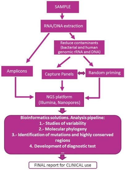 The recent pandemic caused by Severe Acute Respiratory Syndrome Coronavirus-2 (SARS-CoV-2) has exposed the weakness of our surveillance system with regard to preventing and monitoring the emergence and spread of emerging, re-emerging or new viruses. One of the lessons that has been drawn from this pandemic is that the use of high-throughput technological tools for the early detection and rapid identification and characterization of the causal agent, is essential for controlling the worst effects of any pandemic. Currently, next-generation sequencing (NGS) technologies for metagenomics, whole-genome sequencing (WGS) and targeted deep-sequencing are the best tools for genetic identification and characterization of viral agents, for studying their variability, allowing for the correct classification of the agent, identifying viral genetic markers associated with virulence, and considering antigenicity and susceptibility to antivirals based on pre-existing knowledge where available [1,2,3,4,5]. Other ways to describe NGS include deep-sequencing, massive parallel sequencing, high-throughput sequencing, all equally valid, to differentiate it from Sanger sequencing. During the current SARS-CoV-2 pandemic, NGS technologies have allowed for the development in record time (months) of highly effective vaccines based on mRNA/DNA [6], the development of qualitative and quantitative diagnostic solutions [7], and the identification of variants and relevant mutations in continuous surveillance [8], especially of variants with evidence of mutations impacting transmissibility, severity and/or immunity, known as variants of concern (VOC), and of their dominance and spread throughout the world [9]. Early detection of VOC is important because any delayed or null identification of circulating viral agents calls into question the efficacy of a health system in preventing and responding efficiently to viral infections [10]. It is worth highlighting that it is not yet possible to identify the viral causative agent of between 60% and 80% of meningitis/encephalitis, 50% of acute gastroenteritis, 20% of haemorrhagic fever, and between 15% and 25% of acute respiratory infections in patients admitted to our hospitals [11,12,13,14,15].