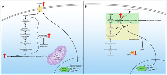 The pentose phosphate pathway (PPP) is a metabolic pathway composed of two arms. The oxidative arm generates NADPH and converts G6P into ribulose-5-phosphate to produce nucleotides through nucleic acid synthesis [29]. The other axis of the PPP is the non-oxidative one that generates fructose-6-phosphate (F6P) and glyceraldehyde-3-phosphate (G3P) from G6P [30]. These products can participate in glycolysis and other metabolic pathways (Figure 2B). The first branch is essential for supplying the cells with ribulose-5-phosphate because of the increased demand for nucleotides. Therefore, the generated NADPH is used for glutathione production, which protects the cell from oxidative stress and apoptosis [31]. NADPH is also used by the cell in the biosynthesis of lipids and other macromolecules, and the increase in NADPH contributes to overall metabolic reprogramming [32].