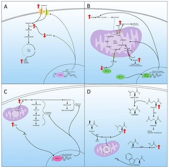 Glutaminolysis, mitochondrial changes, lipid metabolism, and amino acid metabolism in metabolic reprogramming. (A) Upregulation of glutaminolysis via transcriptional regulation and the status of miR-23. The cartoon also displays an increased expression of glutamine transporters and enzymes. (B) A schematic representation of mitochondrial rewiring of the TCA cycle during metabolic reprogramming includes transporting key TCA metabolites outside the mitochondria and the transcriptional regulation of critical enzymes and transporters. (C) Increased lipid metabolism, ROS, and the transportation of citrate out of the mitochondria used for lipid synthesis as a part of metabolic reprogramming. (D) Amino acid metabolism regulation in metabolic reprogramming includes the increase in certain amino acids that act as precursors for others.