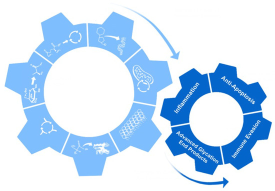 Metabolic reprogramming has many non-metabolic effects on the cell. These can include increased inflammation, anti-apoptosis, immune evasion, and the production and accumulation of advanced glycation end products (AGEs) [226]. Some of these effects are essential for viral replication and promotion of tumors, while others are byproducts of the changes that occur with metabolic reprogramming and help modify the cellular environment (Figure 4) [227].