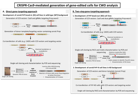 CRISPR-Cas9 (CC9)-based gene-editing for generation of cell culture models to study chronic wasting disease (CWD). Two general CC9 gene-editing approaches can be used to create CWD cell culture models: (A) direct gene-targeting/knock-in (KI), and (B) two-step gene-targeting involving knock-out of endogenous Prnp followed by knock-in of cervid Prnp at the disrupted Prnp locus. (A) Gene-targeting using CC9 in presence of a donor template (cervid Prnp) results in KI clones where site-specific CC9-induced double-stranded break (DSB) facilitates the homology-directed repair (HDR) mechanism by which cervid Prnp will replace the mouse Prnp in the genome. (B) In the two-step approach, firstly, PrP knock-out (KO) cells are generated using CC9-mediated gene disruption. By employing CC9, two DSBs can be induced in the Prnp gene locus of suitable mouse PrP-expressing cells, followed by gene repair by non-homologous end joining (NHEJ) resulting in indels or Prnp deletions. Such not-in-frame deletions or indels cause loss of functional PrP expression resulting in PrP-KO cells, as already shown for CAD5 and mouse embryonic fibroblast (MEF) Prnp−/− models [78]. Later, PrP-KO cells can be used for gene-targeting using CC9 in presence of a cervid Prnp template, which will be inserted at the disrupted Prnp locus via HDR.