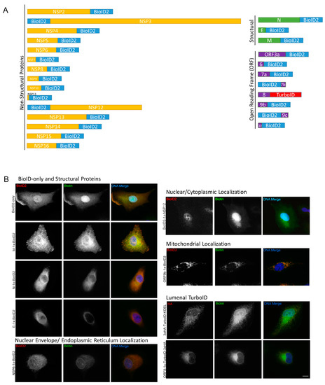 - Laurent, E.M.N.; Sofianatos, Y.; Komarova, A.; Gimeno, J.-P.; Tehrani, P.S.; Kim, D.-K.; Abdouni, H.; Duhamel, M.; Cassonnet, P.; Knapp, J.J.; et al. Global BioID-based SARS-CoV-2 proteins proximal interactome unveils novel ties between viral polypeptides and host factors involved in multiple COVID19-associated mechanisms. bioRxiv 2020. [Google Scholar] [CrossRef]