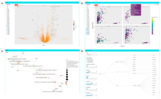 All datasets were collected to build a COVID-19 Proteomics Resource for the scientific community. We created an interactive ShinyApp website to disseminate and explore the functional landscapes of SARS-CoV-2 viral protein interactomes and proteomes. At https://alexproteomics.shinyapps.io/covid19proteomics, accessed on 4 March 2022, we have made all global abundance and proximity-labeling MS data publicly available along with several tools to enable statistical and bioinformatics analysis. The website allows users to interactively explore the data, easily set confidence thresholds, and run functional enrichment analysis using, for example, a hypergeometric test against the Broad Institute molecular signature databases (v7.4) including canonical pathways (Reactome, KEGG, WikiPathways), immune collection, chemical and genetic perturbation signatures, regulatory transcription factor targets (TFT), oncogenic signatures, and Gene Ontology (Human Phenotype, Cellular Component, Biological Process and Molecular Function). In addition, users can compare functional enrichment of defined groups of viral proteins using the compareCluster function of the clusterProfiler R Bioconductor package. Our website allows for the comparison of our BioID dataset with three other interactome datasets, and uses the CLUE drug library to annotate potential therapeutic targets specifically identified in our BioID data. Finally, all data are available to download in spreadsheet form if the user wishes to further supplement their analysis with other available tools (e.g., STRING, Metascape). Examples of website functionality are shown in Figure 2.