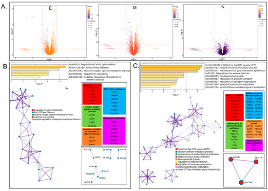 The Membrane (M-), Nucleocapsid (N-), and Envelope (E-) proteins are three of the four structural proteins of SARS-CoV-2, and are known to interact with each other [40]. Both M- and E-protein are membrane proteins important for viral entry, and N-protein is the primary RNA-binding protein involved in properly packaging viral RNA into new vesicles [41]. In order to take a closer look at how SARS-CoV-2 structural proteins influence host-cell protein expression, global changes were visualized via volcano plot (Figure 3A) and the 24 upregulated and 57 downregulated proteins from Table S2 were analyzed via Metascape express analysis (Figure 3B,C). The top two significantly enriched terms identified for upregulated proteins were regulation of actin cytoskeleton (hsa04810; p > 10−4) and RHO GTPase effectors (R-HAS-195258; p > 10−3) (Figure 3B), suggesting mechanisms by which SARS-CoV-2 remodels cytoskeletal networks for viral entry and budding. Additionally, three subsets of protein–protein interaction networks were identified, including several proteins involved in differentiation [42,43,44,45,46]. We identified significantly enriched terms in the group of downregulated proteins, including cellular hormone metabolic process (GO:0034754; p > 10−5) and maintenance of gastrointestinal epithelium (Figure 3C). Further investigation of these proteins could elucidate how viral infection hijacks cellular metabolism and/or causes symptoms of gastrointestinal distress. Taken together, these whole-cell proteome datasets will act as an important foundation to direct potential future investigational studies.