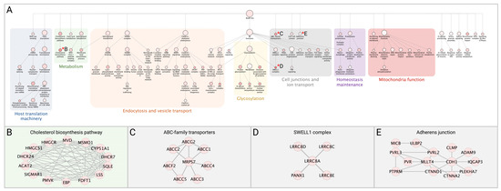 In addition to whole-cell proteomic analysis, each stable cell line was subjected to BioID proximity-labeling to identify specific viral-host PPIs. Following statistical test, we identified 3011 significant viral-host PPIs, with a log2FC ≥ 2.3, p value ≤ 0.01, at least two quantitative peptide features, and detected in less than 75% of the proximity-labeling CRAPome contaminant database experiments. This list of significant PPIs is an available resource on our COVID-19 Proteomics Resource website, allowing users to interactively explore networks and functions of the detected PPIs. To understand the functional and biochemical relationships between the identified SARS-CoV-2 interactors, we conducted hierarchy and pathway enrichment analyses (see Methods) on a subset of 876 proteins uniquely associated with one of the 26 SARS-CoV-2 proteins (Table S3) with CrapomeScore ≤0.5 (i.e., detected in 50% or less of the CRAPome proximity-labeling experiments; see Methods). These analyses revealed that most identified SARS-CoV-2 interactors were associated with seven clusters that included host translation machinery, endocytosis and vesicle transport, metabolism, glycosylation, cell junctions and ion transport, maintenance of homeostasis, and mitochondrial function (Figure 4A). Subclusters within host translation included processing of mRNAs and non-sense mediated decay (NMD) (p = 1.13−36), which is involved in degradation of aberrant self and non-self mRNAs, including those of coronaviruses [47]. Consistent with previous systems-level studies of SARS-CoV-2, a significant number of the interactors were associated with endocytosis and vesicle trafficking pathways, including members of the SNARE complex, which are important for membrane fusion of vesicles and exocytosis [48], as well as GTPases that regulate vesicle docking and likely support SARS-CoV-2 trafficking and egress. Notably, we found a highly enriched cluster of SARS-CoV-2 interactors involved in cholesterol biosynthesis (p = 1.13−24) (Figure 4B), providing further evidence of the importance of this pathway for SARS-CoV-2 replication and highlighting potential targets for therapeutic efforts [49]. SARS-CoV-2 interactors were associated with mitochondrial function, including proteins of the TIM/TOM complex that mediate mitochondrial import (p = 1.44−11) and proteins involved in the electron transport chain (p = 2.93−14) and oxidative phosphorylation (p = 3.32−7), which could reflect the energetic requirements of SARS-CoV-2 for replication [50]. Notably, our analysis revealed several pathways involved in cell junctions and ion transport. These included members of the SWELL complex (Figure 4C), which are involved in transport of cGAMP generated upon activation of the immune sensor cGAS by DNA viruses or mtDNA release [51], as well as proteins involved in cell adherens junctions (p = 2.01−5), previously shown to be targeted by viruses to alter the environment of bystander cells and suggested as therapeutic targets to prevent viral spread [52]. In addition, amongst novel SARS-CoV-2 interactors were several members of the ABC-transporter family (p = 7.58−12) (Figure 4D), involved in translocation of substrates across membranes and previously linked to development of multidrug resistance (MDR) and oxidative stress response to viral and bacterial infection [53]. Proteins interacting with SARS-CoV-2 were associated with the peroxisome (p = 1.88−6). SARS-CoV-2 infection has been shown to recruit peroxisomes to viral replication organelles, and the association of SARS-CoV-2 with members of the peroxisome could reflect a requirement to reduce oxidative stress resulting from the extensive remodeling of cellular endomembranes or as a lipid source for viral replication [54,55].