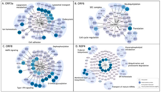 Enriched pathway analysis of PPIs for selected SARS-CoV-2 viral baits. (A–D). High-confidence associations between indicated SARS-CoV-2 proteins (hexagons) and human proteins (circles/nodes). Node color is proportional to the p value (the darkest, the lowest the p value). Human–human interactions as determined by STRING are represented by dashed edges. Human–viral interactions are indicated with solid edges, and their thickness are proportional to the log2FC (the thickest, the highest log2FC).