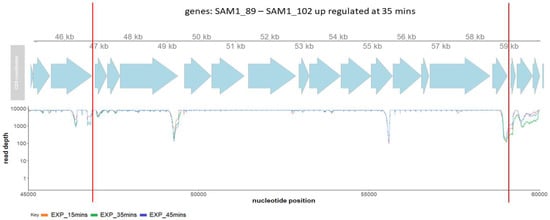 Comparison of RNA-Seq sequence depth with gene map (region spanning bases 45,000 to 60,000) of Staphylococcus phage SAM1. The gene map comprises of arrows representing genes, their length and location, with the direction of the arrow indicating direction transcription. It can be observed that areas of low sequence coverage often correlate with the gene cluster boundary (red lines) that are up regulated at similar time points during phage infection of the host.