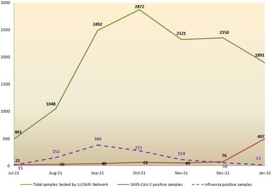 During the study period (between Epi Week 27 of 2021 and Epi Week 4(+2 days) of 2022), a total of 13,467 ILI/SARI samples were tested by the network, out of which 8776 and 4691 were from community and hospital settings, respectively. A total of 416, 593 and 770 samples were positive for influenza A, B, and SARS-CoV-2, respectively. Monthly influenza and COVID-19 test positivity as captured by the surveillance network is depicted in Figure 1. From July to November 2021, influenza test positivity was higher than COVID-19 positivity, with peak influenza activity observed in September 2021 (384 positive cases out of 2492 samples (15.4%) tested across the network). However, COVID-19 positivity increased in December 2021, with a sharp rise in January 2022 (497 COVID-19 cases out of 1891 samples (26%) tested across the country).