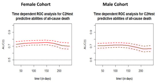 The time dependent receiver operating characteristic (ROC) analysis in both study cohorts revealed that the C2HEST scale is more sensitive in the female cohort (Figure 1). The C2HEST predicting AUC in women vs. man cohorts were higher at all calculated periods. Following the 1-month AUC = 72.5 vs. 70.3% 3-month AUC = 74.6 vs. 71.3%, six-month AUC = 73.8 vs. 68.4 %. All of the data were calculated for all-cause death without competing risk Figure 2 present ROC analysis in the male population. Figure 3 presented the time-dependent AUC for the C2HEST score in predicting the all-cause deaths in both cohort, slightly higher AUC value was observed in the female arm. The survival curves for the C2HEST stratum in both study cohorts were estimated using Kaplan-Meier functions. The p value for Log-rank test was <0.0001 (Figure 4). We have observed differences in estimated survival probability in both study cohorts. Practically, starting from admission time, the females were more likely to survive the COVID-19. Estimated six-month survival probability for high-risk subjects reached 0.5 in the female cohort, while for the male subject was below 0.4. Similarly, in medium-risk-stratum for women the survival probability was above 0.6 when compared to 0.5 in men. Additionally, the low-risk subjects in the female cohort maintained at the level of more than 0.9 for the whole observation period while in men reached 0.8, respectively.