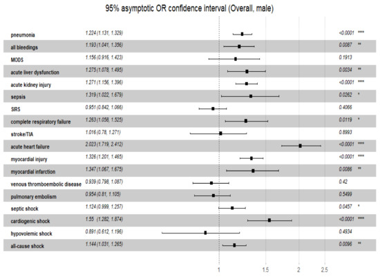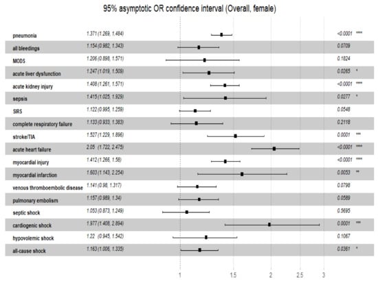 The overall odds ratio for the discriminatory performance of the C2HEST score on the clinical non-fatal events in female cohort. Abbreviations: MODS, multiple organ dysfunction syndrome; TIA, transient ischemic attack; SIRS, systemic inflammatory response syndrome. Significance code: * <0.05; ** <0.01; *** <0.001; **** <0.0001.