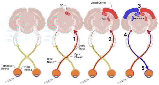 Prion spread following intraocular inoculation. Inoculation of prions into the retina of rodents results in anterograde spread of prion agent from the inoculated retina to the contralateral superior colliculus (SC; 1) and lateral geniculate nucleus (LGN), and visual cortex (solid red line and red structures; 2). As the animal approaches clinical endpoint, the ipsilateral SC, LGN, and visual cortex are also affected to a lesser extent (blue structures). This is thought to be due to reciprocal connections between the contralateral SC (solid black arrow; 3) and LGN (dashed black arrow; 3) and ipsilateral anterograde spread from the inoculated retina (dashed red line; 4). The uninoculated optic nerve and retina are also affected through retrograde prion spread (solid blue line; 5). Image created with BioRender.com, accessed on 28 February 2022.