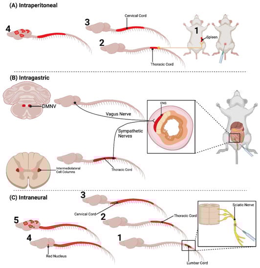 Prions spread along defined neuroanatomical pathways. (A) Prions inoculated through the intraperitoneal route (i.p.) initially accumulate in the spleen (1) before spreading along autonomic nerves into the thoracic spinal cord (2). Subsequent spread is rostrally within the spinal cord (3) to the brainstem and eventually into the brain (4). (B) Intragastric prion inoculation results in PrPSc accumulation in the myenteric plexus of the enteric nervous system (ENS) then subsequent spread along sympathetic efferent nerves to the thoracic spinal cord or directly to the dorsal motor nucleus of the vagus (DMNV) via parasympathetic vagal efferents. As with i.p. routes, spread occurs rostrally within the spinal cord to the brain. (C) Intraneural infection of prions results in spread along defined neuroanatomical pathways. In the case of the sciatic nerve, prion spread occurs along nerve roots to the VMNs of the lumbar spinal cord (1). Subsequent spread of prions in the spinal cord occurs in the rostral direction (2 and 3) toward brainstem nuclei that include the red nucleus (RN), vestibular nucleus, and cortex (4 and 5). Image created with BioRender.com, accessed on 28 February 2022.