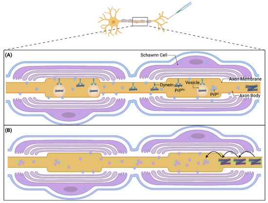 Prion Transport Mechanisms. Current theories of PrPSc axonal transport after neuroinvasion include retrograde PrPSc transport on dynein motors (A) in a traditional axonal transport paradigm. Of note, PrPSc may be free aggregates or contained within membranous vesicles such as endosomes or lysosomes. A “domino-like” mechanism has also been proposed (B), where PrPSc initiates the conversion of neighboring PrPC, and this conversion chain continues down the length of the axonal projection. Image created with BioRender.com, accessed on 28 February 2022.