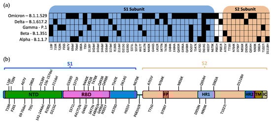 The World Health Organization (WHO) currently designates five strains of SARS-CoV-2 as variants of concern (VOC): Alpha, Beta, Gamma, Delta, and Omicron [15]. The Pango lineages for these variants are B.1.1.7, B.1.351, P.1, B.1.617.2, and B.1.1.529, respectively [16]. The defining mutations for each SARS-CoV-2 variant and their relative location within S are shown in Figure 2a,b, respectively.