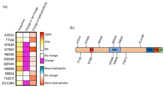 Mutations occurring within the S2 subunit of SARS-CoV-2 spike protein. (a) Frequency, modification in charge at physiological pH, and alteration in hydrophobicity for mutations occurring within the S2 subunit. (b) Visual representation of mutations occurring within the S2 subunit.