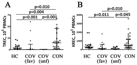 T cell receptor excision circles (TREC) and Kappa-deleting recombination excision circles (KREC) counts in patients with acute COVID-19 and COVID-19 convalescent patients. Scatters plots (A,B) showing the numbers (copies per 105 cells) of TRECs and KRECs, respectively Black circles—healthy control (HC, n = 24); black triangles—patients with acute COVID-19 (COV (fav), favorable outcome, n = 25); black squares—patients with acute COVID-19 (COV (unf), unfavorable outcome, n = 8); and white circles—COVID-19 survivors (CON, convalescent patients with favorable outcome of acute COVID-19, n = 33). Each dot represents individual subjects, and horizontal bars depict the group medians and quartile ranges (Med (Q25; Q75). Statistical analysis was performed with the Mann–Whitney U test.