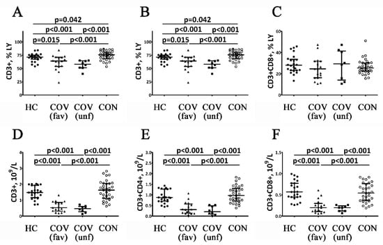 Altered relative and absolute numbers of main T cell subsets in patients with acute COVID-19 and COVID-19 convalescent patients. Scatters plots (A–C) and (D–F) showing the percentages (the percentage of T cell subset within total lymphocyte population) and absolute numbers (number of cells in 1 liter of peripheral blood, 109/L) of T cells (CD3+), T-helpers (CD3+CD4+) and cytotoxic T cells (CD3+CD8+), respectively. Black circles—healthy control (HC, n = 24); black triangles—patients with acute COVID-19 (COV (fav), favorable outcome, n = 25); black squares—patients with acute COVID-19 (COV (unf), unfavorable outcome, n = 8); and white circles—COVID-19 survivors (CON, convalescent patients with favorable outcome of acute COVID-19, n = 33). Each dot represents individual subjects, and horizontal bars depict the group medians and quartile ranges (Med (Q25; Q75). Statistical analysis was performed with the Mann–Whitney U test.