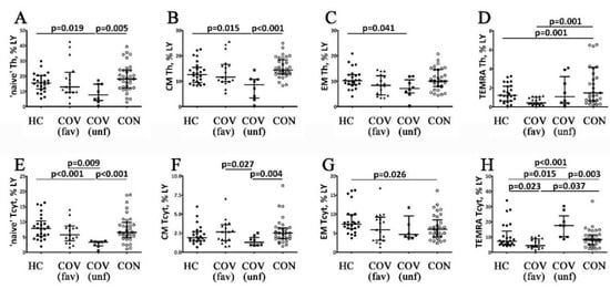 Alterations in relative numbers of T cell subsets with different patterns of CD45RO and CD62L expression in patients with acute COVID-19 and COVID-19 convalescent patients. Scatters plots (A–D) and (E–H) showing the percentages of ‘naïve’ (CD45RO−CD62L+), central memory (CM, CD45RO+CD62L+), effector memory (EM, CD45RO+CD62L−) and terminally differentiated CD45RA-positive effector memory (TEMRA, CD45RO−CD62L−) T-helpers and cytotoxic T cells, respectively. The data represents the percentages of T cell subsets within total lymphocyte population. Black circles—healthy control (HC, n = 24); black triangles—patients with acute COVID-19 (COV (fav), favorable outcome, n = 25); black squares—patients with acute COVID-19 (COV (unf), unfavorable outcome, n = 8); and white circles—COVID-19 survivors (CON, convalescent patients with favorable outcome of acute COVID-19, n = 33). Each dot represents individual subjects, and horizontal bars depict the group medians and quartile ranges (Med (Q25; Q75). Statistical analysis was performed with the Mann–Whitney U test.
