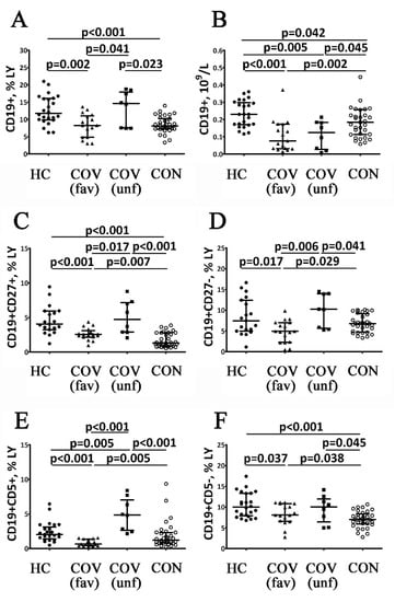 Alterations in B cell subsets in patients with acute COVID-19 and COVID-19 convalescent patients. Scatter plots (A,B) show the percentages (the percentage of B cells within total lymphocyte population) and absolute numbers (number of B cells in 1 L of peripheral blood, 109/L) of B lymphocytes (CD19+), respectively. Scatter plots (C,D) show the percentages (the percentage of B cell subsets within the total lymphocyte population) of CD27-positive and CD27-negative B cells, respectively. Scatter plots (E,F) show the percentages (the percentage of B cell subsets within total lymphocyte population) of CD5-positive and CD5-negative B cells, respectively. Black circles—healthy control (HC, n = 24); black triangles—patients with acute COVID-19 (COV (fav), favorable outcome, n = 25); black squares—patients with acute COVID-19 (COV (unf), unfavorable outcome, n = 8); and white circles—COVID-19 survivors (CON, convalescent patients with favorable outcome of acute COVID-19, n = 33). Each dot represents individual subjects, and horizontal bars depict the group medians and quartile ranges (Med (Q25; Q75). Statistical analysis was performed with the Mann–Whitney U test.