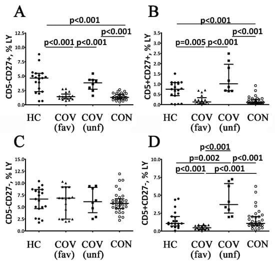 Alterations in relative numbers of B cell subsets with different patters of CD5 and CD27 expression in patients with acute COVID-19 and COVID-19 convalescent patients. Scatter plots (A–D) show the percentages of CD5−CD27+, CD5+CD27+, CD5−CD27− and CD5+CD27− B cells, respectively. The data represents the percentages of B cell subsets within the total lymphocyte population. Black circles—healthy control (HC, n = 24); black triangles—patients with acute COVID-19 (COV (fav), favorable outcome, n = 25); black squares—patients with acute COVID-19 (COV (unf), unfavorable outcome, n = 8); and white circles—COVID-19 survivors (CON, convalescent patients with favorable outcome of acute COVID-19, n = 33). Each dot represents individual subjects, and horizontal bars depict the group medians and quartile ranges (Med (Q25; Q75). Statistical analysis was performed with the Mann–Whitney U test.