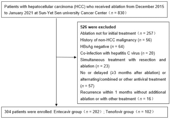 This is a historical cohort study of patients who were treated with either TDF or ETV for CHB after curative RFA for HCC from December 2015 to January 2021. The source population was obtained from a historical cohort of 830 consecutive patients at Sun Yat-sen University Cancer Center (SYSUCC). Of these, 304 patients who were treated with either ETV (n = 202) or TDF (n = 102) were included in the analysis as the study population. All study patients had HCC of BCLC A-B.