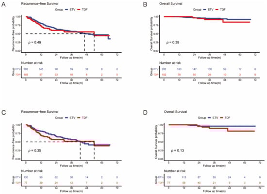 We compared the differences in RFS between the ETV and TDF groups in both the full and matched cohorts. In the full cohort, the probabilities of 1-year, 3-year, and 5-year recurrence were 19.3%, 37.6%, and 41.6%, respectively, in the ETV group and 25.5%, 36.3%, and 37.3%, respectively, in the TDF group (Figure 2A). The median recurrence-free times were 46.3 (95% CI: 35.9–56.7) and 53.9 (95% CI: 8.3–99.5) months in the ETV and TDF groups, respectively. There was no significant difference between the two groups in tumor recurrence (p = 0.49). In the matched cohort, the probabilities of 1-year, 3-year, and 5-year recurrence were 18.5%, 36.2%, and 40.8%, respectively, in the ETV group and 28.6%, 39.0%, and 40.3%, respectively, in the TDF group (Figure 2C). The median RFS was 42.9 (95% CI: 32.6–53.2) and 53.9 (95% CI: 9.3–98.5) months in the ETV and TDF groups, respectively. There was no significant difference between the two groups in tumor recurrence (p = 0.35).