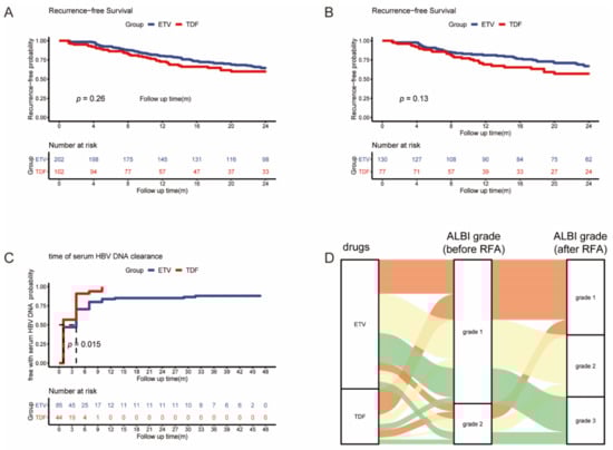 Kaplan–Meier curves of early recurrence between the two groups in full (A) and matched (B) cohorts; Kaplan–Meier curves of serum HBV DNA clearance between the two groups (C); Sankey diagram of ALBI grade change after RFA (D).