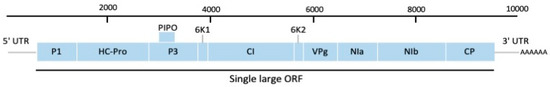 The family Potyviridae is the largest family of RNA viruses to infect plants. There are eight genera in the family and members are distinguished by host range, genomic features, and phylogeny [36]. The virions are flexuous, filamentous particles ranging from 680 to 900 nm in length and 11 to 20 nm in width, whilst the genomes are single-stranded, positive-sense ribonucleic acids (RNAs) ranging from 8.3 to 11.3 kilobase (kb) in length. The typical genome of the family Potyviridae encodes a single large open reading frame (ORF), except for the genus Bymovirus which contains two ORFs. However, a second small ORF termed pretty interesting Potyviridae ORF (PIPO) was discovered embedded in an alternative reading frame [37]. The polyproteins are cleaved into nine or more functional proteins by the endonuclease. Viruses from two genera, Potyvirus and Macluravirus, are important viruses infecting yam and are discussed in the following.