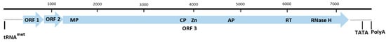 The genus Badnavirus is a group of plant pararetroviruses that have been reported to infect a wide range of economically important plants, such as aroids, banana, black pepper, citrus, cocoa, gooseberry, grape, ornamental spiraea, red raspberry, sugarcane, sweet potato and yam of the tropical and temperate regions of Africa, Asia, Europe, Oceania and the Americas [76,77]. The Badnavirus genome comprises a single circular dsDNA ca. 6.9–9.2 kb encapsulated in a non-enveloped bacilliform particle of ca. 130 nm in length and 30 nm in width [9,78]. The genome contains at least three ORFs in the positive strand (Figure 4), with each strand having a single discontinuity, giving origin to three proteins P1, P2 and P3. The function of P1 remains to be elucidated, the P2 is the virion-associated capsid protein whilst the polyprotein P3 contains many functional domains, particularly, viral movement protein (VMP) (PF01107), coat protein (CP), retropepsin (pepsin-like aspartic protease) (AP) (CD00303), reverse transcriptase (RT) (CD01647) and RNase H1 (RH1) (CD06222) (Figure 4) [9,79,80].