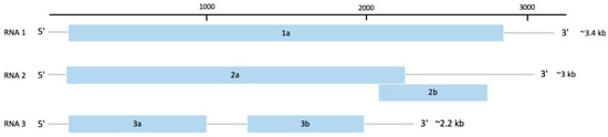 The family Bromoviridae contains some of the most important plant RNA viruses, with members distributed worldwide, infecting over 10,000 plant species [94]. The genomes of this family are tri-segmented, positive-sense, and single-stranded RNAs approximately 8 kb in length [95]. RNA1 and RNA2 encode for proteins involved in virus replication, whilst RNA3 encodes for the proteins, MP and CP (Figure 6). In some members, especially genus Cucumovirus, a fifth protein, P2b, located in RNA2 and part of the C-terminus region of the P2 protein, is involved in silencing suppression, systemic movement, and expression of symptoms (Figure 6) [94].