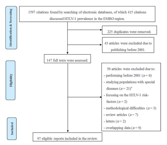 Study selection for the review of HTLV-1 infection epidemiology in the countries of the Eastern Mediterranean Regional Office of the World Health Organization. * Patients with dermatological, hematological, rheumatological, or autoimmune disorders; carcinomas; infectious diseases other then HIV/AIDS; chronic diseases such as cardiovascular disorders and diabetes Melitus, etc.