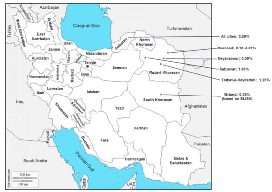 The highest number of published reports on HTLV-1 infection in Southwest Asia was from Iran. However, general population-based reports of HTLV-1 infection were only identified from three among 31 provinces, including Razavi Khorasan, South Khorasan, and Golestan in the north and east parts of the country (Figure 2) [,,,,]. Mashhad, the capital of Razavi Khorasan province, and its neighbor city, Neyshabour, in the northeast of Iran, were previously introduced as HTLV-1 endemic districts in Iran [,,]. Later investigations confirmed that these two cities are still endemic regions for the infection. The overall HTLV-1 prevalence was estimated at 2.12% (35/1654, 95% CI: 1.48–2.93%) among the general population of Mashhad []. Likewise, the HTLV-1 prevalence reached 7.25% (35/483) of individuals referred to a referral laboratory in Neyshabour and 1.06% (2/189) in screens of subgroups including pregnant women or candidates for a surgical operation in that region []. Additionally, many cases with HAM/TSP and ATL were reported in this area [,]. Recent investigations revealed an HTLV-1 prevalence of 1.66% (24/1445) and 1.25% (5/400) in healthy populations of Sabzevar and Torbat-e-Heydarieh cities (located in Razavi Khorasan province), respectively [,]. Lower rates of HTLV-1 infection were reported among the general population of Birjand city, the capital of South Khorasan province (0.35%, 12/3441, based on ELISA results) and Golestan province (0.29%, 6/2034), respectively (Table 1) [,].