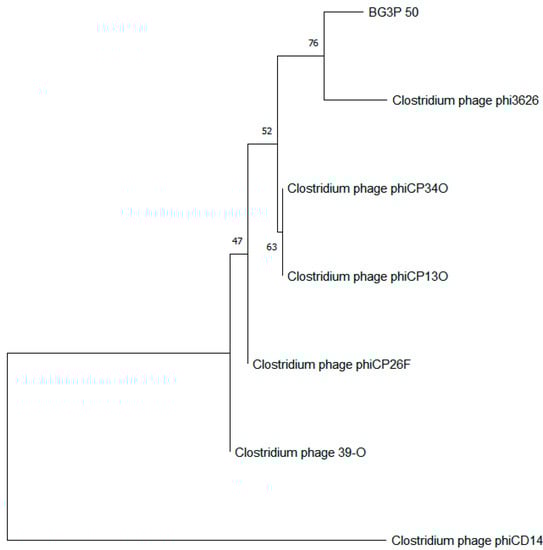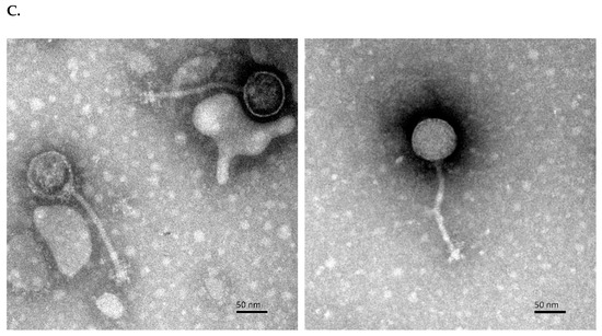 C. perfringens has become a significant problem in the poultry industry due to health issues associated with the consumption of contaminated chicken meat, but also due to significant economic losses derived from broilers with low weight gain and increased risk of mortality []. Taking into account that a 13% increase in meat production is estimated for the year 2027 (OECD-FAO, 2017), new strategies for controlling this bacterium are mandatory. In this context, C. perfringens strains were used to isolate specific phages from farm sewage. A novel C. perfringens phage BG3P was isolated and belongs to the Siphoviridae family. A few studies have characterized the morphology of C. perfringens phages [,,,,,], but they have revealed phages belonging to different families. Other phages belonging to the Siphoviridae family are the C. perfringens phages ΦSM101, Φ3626, ΦCP39O, ΦCP9O, ΦCP13O, and ΦCP26F [,,]. The phage BG3P was different from C. perfringens phages ΦCPV1 and ΦCP24R, which were isolated from broiler chicken intestinal content in Russia and raw sewage from a human waste treatment facility in the U.S. Both C. perfringens phages ΦCPV1 and ΦCP24R belonged to the Podoviridae family and had an isometric polyhedral head of about 50 nm and a short tail [,].