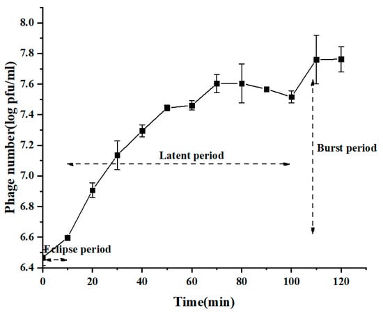 The one-step growth curve was obtained using the improved method described by Hyman et al. []. Briefly, host strains were cultured to the logarithmic growth stage, and then cultures were infected with the phage at a multiplicity of infection (MOI) of 10. Infected host bacteria were incubated at 37 °C for 10 min and then centrifuged to remove culture medium and unadsorbed phages. After washing the pellet twice, preheated AML broth was added to resuspend the cells. Cultures were incubated with shaking at 37 °C, and samples were taken every 10 min for a total of 2 h. The double-layer method was used to determine the phage titer. All assays were performed in duplicate.