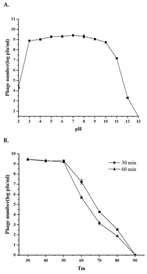 For determining thermal stability, phage samples in SM buffer were incubated at 30 °C, 40 °C, 50 °C, 60 °C, 70 °C, and 80 °C. Aliquots were taken after 30 min and 60 min to determine the phage titer by the double-layer agar method. For analysis of pH stability, samples of the phage were mixed in a series of tubes containing SM of different pH values (2~13, adjusted using NaOH or HCl), incubated for 2 h at 37 °C, and then titered by the double-layer agar method.