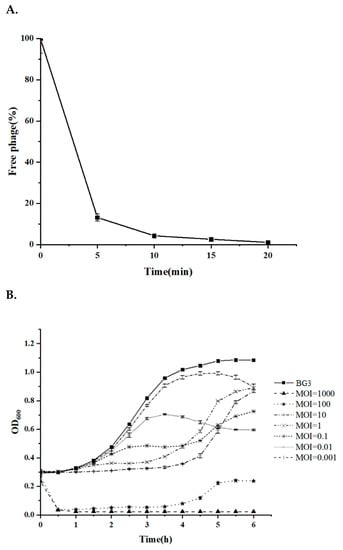 Adsorption of the phage to the host bacterium is the first step of its life cycle and is essential for its lytic activity. In this context, we determined the adsorption of phage BG3P to C. perfringens by measuring the free PFUs in the medium after incubating with C. perfringens BG3 cells. The results showed that the percentage of free phages decreased to 14% at 5 min, and less than 10% at 10 min, indicating that phage BG3P adsorbed to host cells quickly, and the adsorption rate reached more than 90% at about 10 min (Figure 4A).