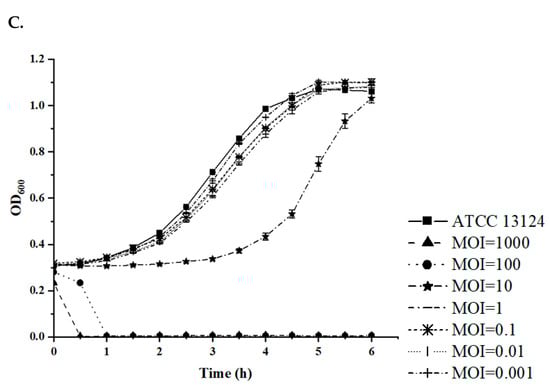 Multiplicity of infection was determined by reference to the improved method []. Host bacteria cultures were obtained by inoculating a single colony in the AML medium and incubated until the logarithmic growth phase (OD = 0.6, 2 × 107 CFU/mL) was reached. Aliquots (2 mL) of these cultures were mixed with the phage and incubated at 37 °C for 3.5 h. Multiplicity of infection (MOI) was calculated to be 1000, 100, 10, 1, 0.1, 0.01, and 0.001. Cultures were centrifuged at 8000 rpm for 30 min, and the supernatant was used to determinate the phage titer.