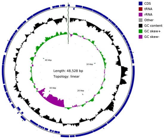 The genomic DNA of the phage was extracted using the Norgen Biotek Phage DNA Isolation Kit (Norgen Biotek Corp. Thorold, ON, Canada). Briefly, phage genomic DNA was obtained through 4 steps of propagating the phage in liquid cultures and preparing the phage supernatant containing 109 PFU/mL, lysate preparation, sample binding to column, column washing, and DNA elution. Genomic DNA sequencing was performed using the Illumina Novaseq platform (Shanghai Personalbio Technology Co., Ltd. Shanghai, China). The standard Illumina TruSeq Nano DNA LT library preparations (Illumina TruSeq DNA Sample Preparation Guide) were used to construct the required online genome libraries. Genemarks [] software was used to predict the protein-coding genes of the genome, and the sequence alignment of the coding genes was completed by Diamond software []. The putative protein function of the ORFs was annotated using the NR database. Diamond BLASTp was used to compare the protein sequences encoded by genes with the protein sequences in the database, to identify the function of the presumed proteins. Non-coding RNAs in the genome were predicted by comparing the ncRNA annotation database http://rfam.xfam.org/ (accessed on 13 August 2021) []. Phylogenetic analysis was conducted using MEGA (version X _10.2.6, Auckland, New Zealand).