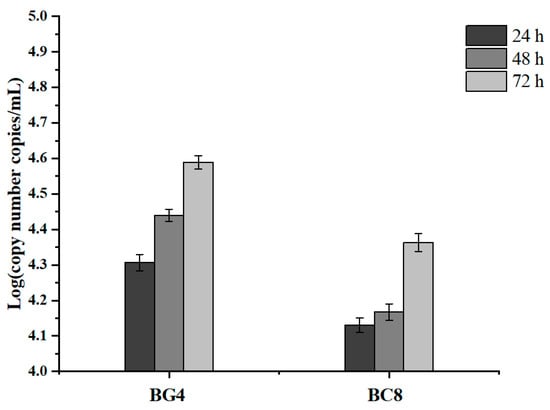 The results showed that 72.72% of the clinical strains carried this CmR gene, but it was not found in the genome of the host strain BG3 (Table 1). In order to determine whether the putative CmR gene orf 15 would be transferred from phage BG3P into the host strain, 10 CmR negative C. perfringens strains (ATCC 13124, CMCC 64722, BG5, RZ-5, BG1, BG3, BC8, BX5, BG4, and BX9-1) were infected with phage BG3P. The results showed that the expression of putative CmR encoding gene (orf 15) could be detected only in two clinical C. perfringens, BG4 and BC8, during 72 h incubation, although the CT values were not very high (32.62 and 33.30). According to the standard curve run by phage BG3P DNA standard (y = −3.009X + 41.0779, R2 = 0.9995, efficiency of the standard curve is 115%), the expression copy numbers of orf 15 in BG4 and BC8 could be calculated as 3.881 × 104 copies/mL and 2.307 × 104 copies/mL (Figure 7).