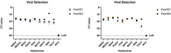 Detection of New and Old World authentic orthohantaviruses by pan-orthohantavirus primers. Amplification CT values for the SYBR green two-step RT-qPCR assay are depicted. Primers were tested against both New and Old World orthohantaviruses cultured in vitro. Thresholds were automatically assigned along with the baseline cycle. Andes Virus (ANDV); Seoul (SEOV); Rio Mamore (RIOV); Puumala (PUUV); Prospect Hill (PHV); Bayou (BAYV); Hantaan (HNTV); Sin Nombre (SNV); Tula (TULV). CT: Cycle threshold. Limit of detection (LoD), Representative of three independent experiments.