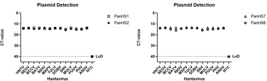 Plasmids from both Old and New World orthohantaviruses are detected by pan-orthohantavirus primers. Amplification CT values for the SYBR green two-step RT-qPCR assay are depicted. Primers were tested against designed plasmids with the sequence of the N gene from the S segment of both New and Old World orthohantaviruses in a pFastBac1 vector. Thresholds were automatically assigned along with the baseline cycle. Hantaan (HNTV); Seoul (SEOV); Black Creek Canal (BCCV); Bayou (BAYV); Rio Mamore (RIOV); Maporal (MAPV); Tula (TULV); Dobrava (DOBV); Sin Nombre (SNV); Muleshoe (MULV); Puumala (PUUV); Prospect Hill (PHV); Andes Virus (ANDV). CT: Cycle threshold. Limit of detection (LoD). Representative of three independent experiments.