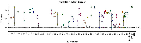 PanHS8 detects orthohantaviruses other than Sin Nombre virus (SNV) in wild-caught animals. Amplification CT values for the SYBR green two-step RT-qPCR assay are depicted. PanHS8 was selected and tested against cDNA from the lung tissue of 100 wild-caught animals. Positive PanHS8 samples are shown in color. Thresholds were adjusted to where the amplification efficiency peaked, and the baseline cycle was adjusted to 5 to 15 cycles. SNV virus and confirmed negative wild-caught rodents were used as controls. Beta actin was tested in parallel as a control. Sample IDs were replaced with a rodent ID for plotting purposes. Each set of dots is represented by a standard error bar and mean. CT: Cycle threshold. Limit of detection (LoD).