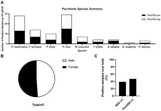 Summary of rodent species positive for PanHS8. Overall results indicating several species of Peromyscus along with additional rodents carrying orthohantavirus. (A) Positive rodents by species and genus for PanHS8 (black) compared to negative PanHS8 samples (white). (B) Sex was calculated using the total rodents positive for PanHS8. (C) Summary of the total percentage of positive samples by both SNV TaqMan and PanHS8 for an orthohantavirus.
