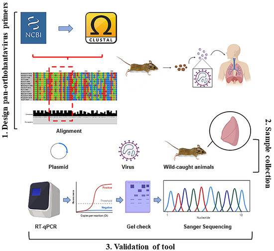 Overall summary of two-step RT-qPCR pan-orthohantavirus detection tool. 1. S segment sequences from both New and Old World orthohantaviruses were compiled and aligned through NCBI and CLUSTAL Omega. Little to no completely conserved regions existed; therefore, degenerate primers were designed. 2. Samples (plasmids, in vitro cultured virus, and lung tissue from wild-caught rodents) were used to validate primer selection. 3. Two-step RT-qPCR was performed followed by DNA gel electrophoresis. Sanger sequencing was also used for additional confirmation in positive lung tissue samples from wild-caught rodents.