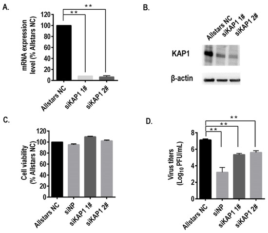 Knockdown of KAP1 resulted in a reduction in influenza virus replication. A549 cells were transfected twice with negative control siRNA (Allstars NC) or two siRNAs targeting human Kap1 (siKAP1 1#; siKAP1 2#). (A) qPCR to confirm the relatively low level of mRNA expression in siKAP1-treated A549 cells. (B) Western blotting with anti-KAP1 or anti-β-actin antibody to confirm the knockdown efficiency. (C) Cell viability of siRNA-treated cells was determined by using CellTiter-Glo reagent. (D) Virus growth in siRNA-treated A549 cells infected with WSN virus at an MOI of 0.001 and the supernatant was collected at 48h post-infection. (h.p.i: hours post-infection). Means ± SD of triplicate experiments is shown in (A,C,D). ** p < 0.01 (two-way ANOVA followed by Dunnett’s test).
