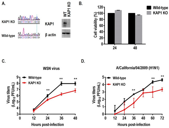 Knockout of KAP1 in A549 cells significantly reduced the influenza A virus growth. (A) One nucleotide “G” at position 82 of the KAP1 mRNA was deleted, this was confirmed by Sanger sequencing, and the absence of KAP1 expression in A549 cells was validated by Western blotting. (B) Cell viability of KAP1 was detected by using CellTiter-Glo reagent. (C) Deletion of KAP1 resulted in a significant reduction of WSN virus growth. (D) Deletion of KAP1 resulted in the significant reduction of CA04 pdmH1N1 virus growth. ** p < 0.01 (two-way ANOVA followed by Dunnett’s test).